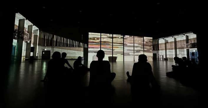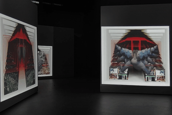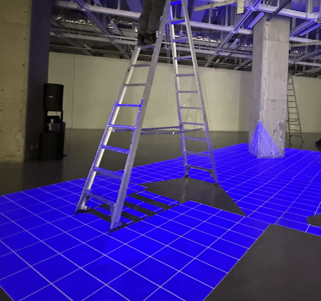 3チャンネル映像(カラー、音声)、金属アーム、ほかサイズ可変 6’07” (1.7×1.7×1.2M)